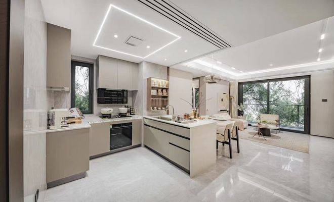 双面加宽组合型岛台,岛台长度从传统的60mm拓展至90mm,拓展操作空间;其他像预留双开门冰箱位、灶台背面大板砖、顶面线性灯+凉霸等人性化品质细节,也都是交付标准!