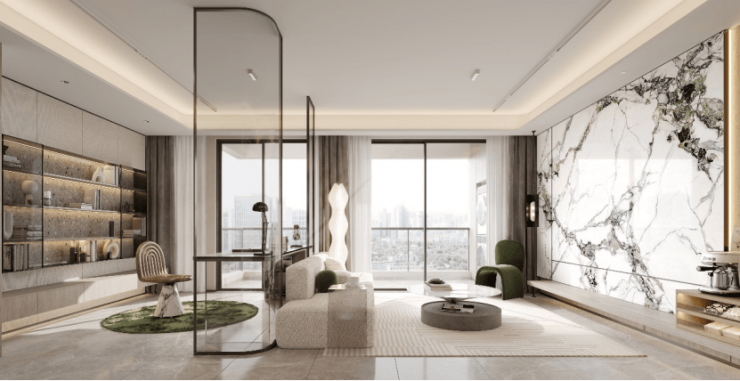 客厅岩板背景墙的应用,典雅气派、肌理丰富,营而着简约不失奢华的家居氛围。