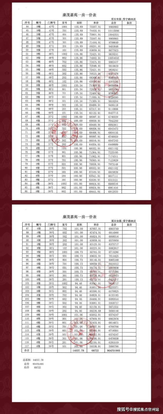 一房一价表: