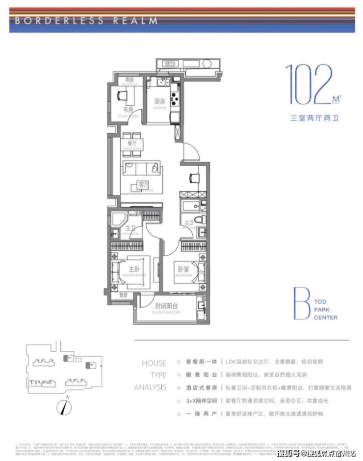建面约102m²户型特点: LDK洄游式景观边厅,景致拉满,3+X陪伴空间,承载更多自定义功能需求,开放式厨房,烹饪与客餐厅无界互动。
