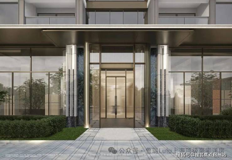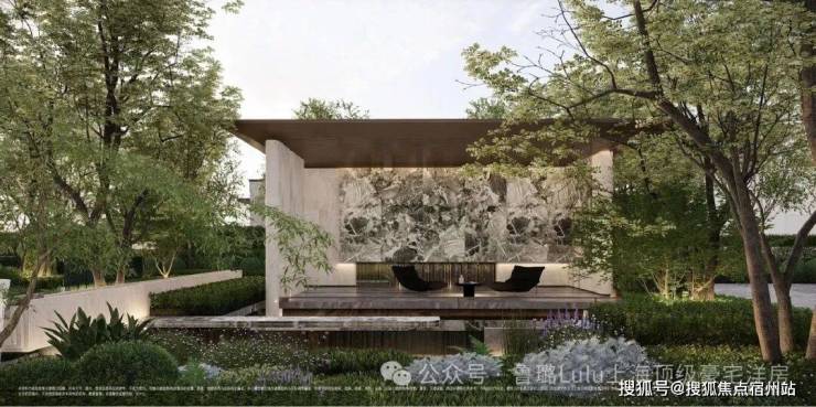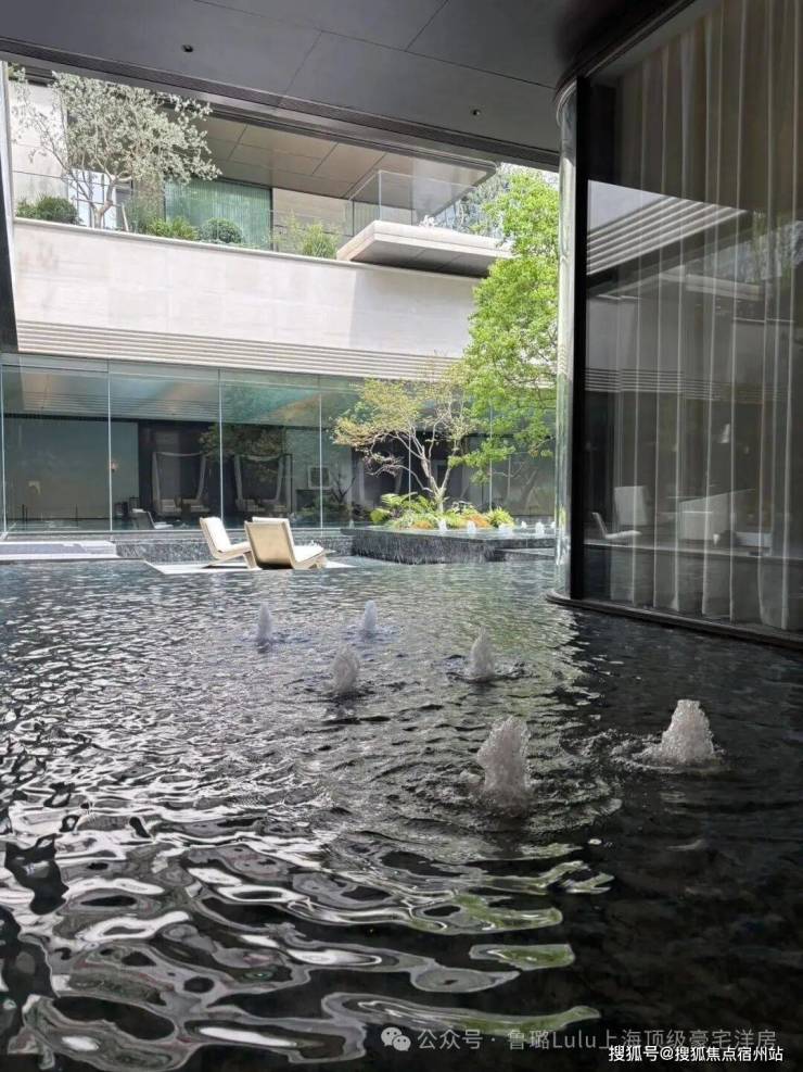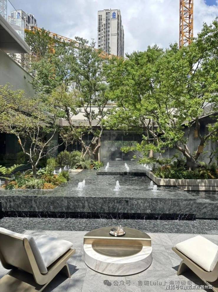 近距离看,项目的入口细节之处又不失奢华,尤其是大量 名贵石材 (安哥拉黑石材)的运用绝对是大手笔,椭圆形水池搭配波光粼粼的水景,这里还种植了一株约 7米高的铁冬青, 宛如翡翠屏风,豪门大院的气质扑面而来。