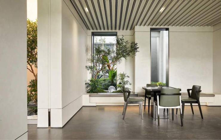 用料上,庭院两侧设计师选用大理石与镂空铝板虚实结合,利用2层柏翠造型铝线条错拼而成,更显精致;