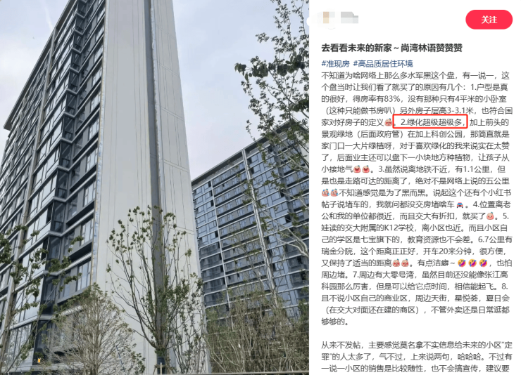 另外在社交媒体上,众多业主纷纷为项目低容积率、户型得房率、景观河道等点赞。