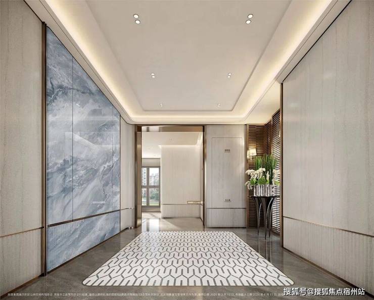 第四是 入户大堂,楼栋入户大堂走海派轻奢风,地面用石材拼花造型,墙面做了石材背景墙,门口搭配金属线条装饰。