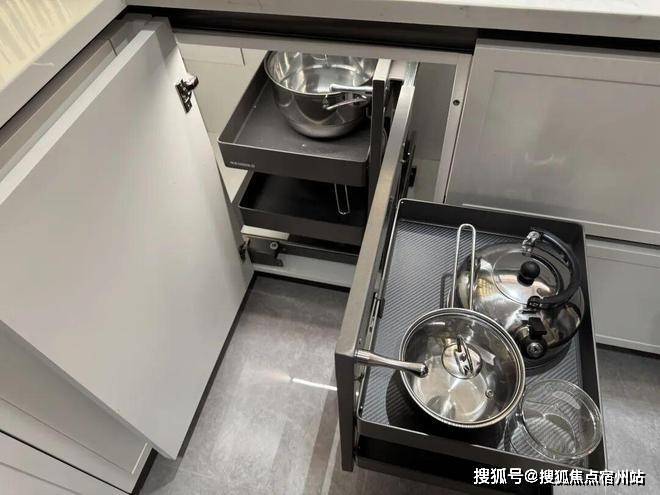 厨房收纳的痛点就是橱柜内部拐角处的东西很难取,象屿设计的这套 拉篮 ,可以很轻松的取出内部的东西,不至于浪费空间(毕竟小户型就这点地方,合理利用很重要)。