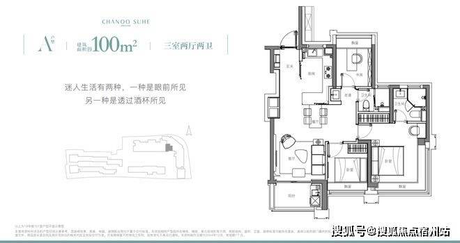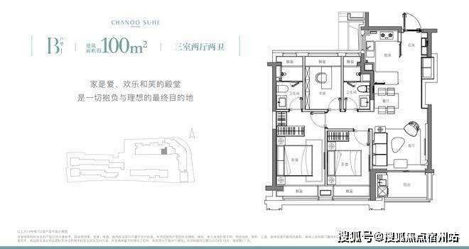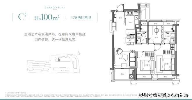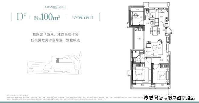 象屿苏河琹庐的产品是目前比较常见、但未来会更少的百平正三房,132套,百分百的中小套户型。来看下户型图,A、D是边套,B、C是中间套。