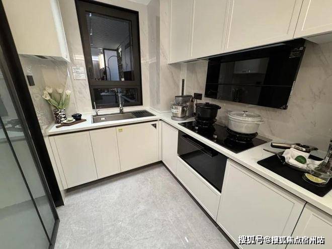 U型厨房操作台面,在靠餐厅的一侧下方也做了一些开放的收纳空间,本就是方便业主取用,做成落地式移门,关着的时候就不方便拿东西了;不留卫生死角,油烟大的时候,难免会对厨房空间留下点痕迹,做成这种岛台上轨道移门,可以避免岛台和移门中间的地面缝隙、收纳格内部沾上油烟。