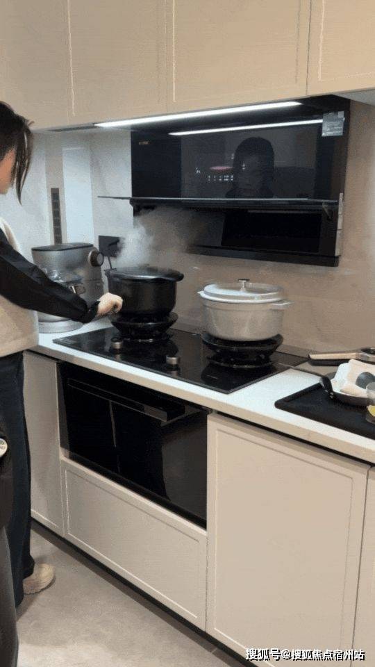 中式厨房比较重油烟,象屿采用的是 国产高端品牌方太厨具 ,而且方太这款厨具是集成灶,下方蒸烤,台面上是燃气灶,联动上方的空调烟机,这吸力看动图就知道了