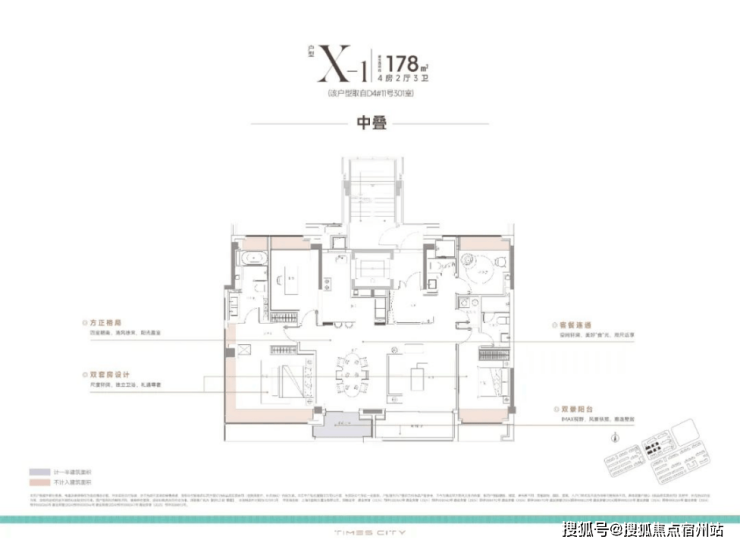 中平户型以四开间朝南的IMAX级采光面,打造出堪比市区豪宅的尺度感。4房4飘窗2阳台的设计,配合双套房布局,一共有三个套房,让每个家庭成员都享有独立私密空间。