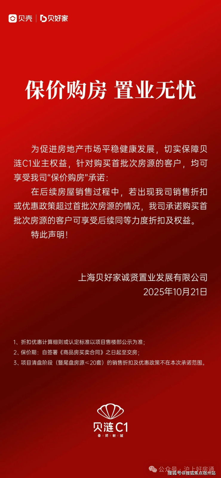 10月21日,贝壳旗下贝好家在上海的首个项目“贝涟C1”发布公告,推出“保价购房”承诺:凡购买首批房源的客户,若后期出现更大力度的销售折扣或优惠,可同步享受同等级别的权益补差。