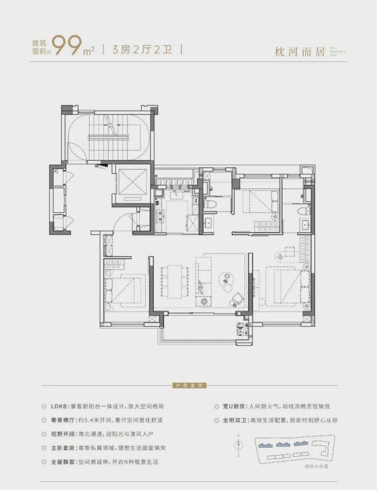 建面约99㎡滨水高层户型方正,功能性与尺度感兼得,在保证采光的同时,呈现开阔的空间场景。