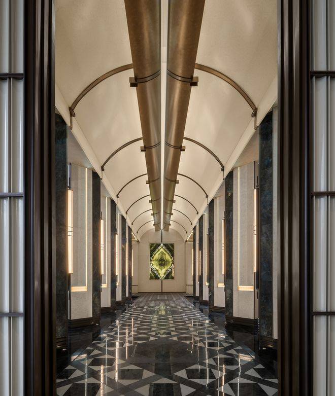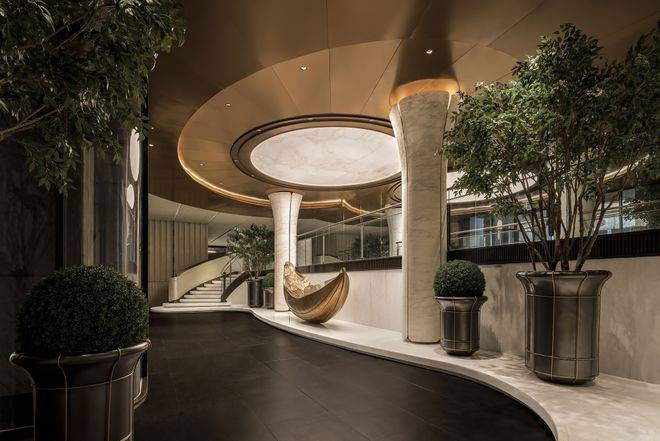 大门两侧,矗立的巨型花钵,表面镶嵌着来自意大利的“翡翠星河”超薄奢石,蕴藏着如宇宙星痕般的细腻脉络,花钵之上,傲然挺立着远渡重洋而来的爱知县的老桩茶梅盛迎业主归家。举步徐行,来到致敬金贝尔美术馆打造的「天穹光廊」,长廊的地面由蓝翡翠奢石+纯净汉白玉+温润的温德姆灰石材3种奢石,经过精细切割与拼花,复现了香港中银大厦极具几何美学的拼花,中轴对称的庄严格局,将空间升华为博物馆级的艺术殿堂。