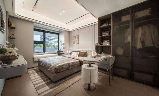 不过尺度感更为出挑:首先是主卧大套房贯穿南北,自带衣帽间+卫生间+飘窗,气度非凡,尊崇备至。其次客餐厨一体化设计,整个公区几乎没有面积浪费,营造的空间感和尺度感远超同价位其他竞品!