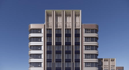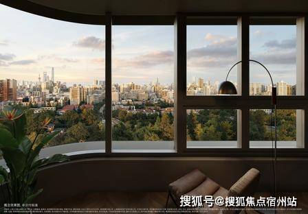 住宅立面采用蓝金交融的高级色调,搭配流光幻彩艺术铝板、反弯弧形玻璃与 ArtDeco 弧形工艺,致敬邬达克装饰艺术派美学,大量弧线设计让建筑更显灵动优雅。珍珠蓝、香槟金、海派砖红的色彩搭配,搭配 270° 圆弧转角玻璃阳台,白天折射光影变幻,夜晚点亮城市天际线,成为中兴路板块的标志性建筑,辨识度与颜值双高。