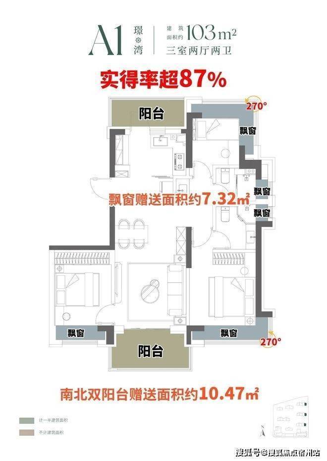 建面约103㎡A1户型,约10.47㎡南北双阳台空间,阳台“买1赠1”,赠送约5㎡,南侧观景阳台,北侧功能阳台,更附赠约7.32㎡飘窗,实得率超87%。