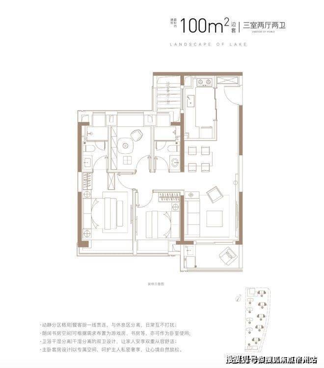 三开间朝南+主卧套房设计+动静分离+全卧室带飘窗,功能性和尺度感完美结合的3房,能满足业主从二人世界到三口之家,再到二胎家庭的全生命周期需求。