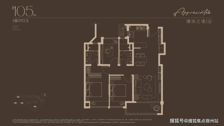 建面约105平方米三房两厅两卫:三开间朝南,南向面宽约9.6米。客餐厅一体化开放式设计,创新研发S墙设计,预留冰箱专属位置,释放厨房使用空间。主卧套房设计,平衡舒适与格调。总价约420万起。