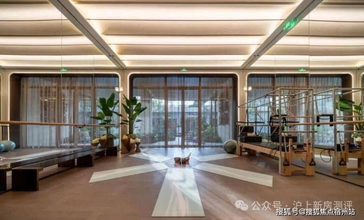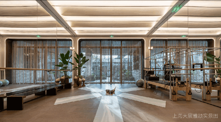 汗水滴落如晨露,呼吸随普拉提的动作起伏,每一次重复都是向前的印记,也是缪斯喜爱的健康生活方式。序厅和健身房内部设计为天花圆形发光膜和弧形艺术玻璃门,在大量拱形元素中点缀部分拼花装饰,让整个空间彰显柔润平和的质感与井井有条的秩序感。