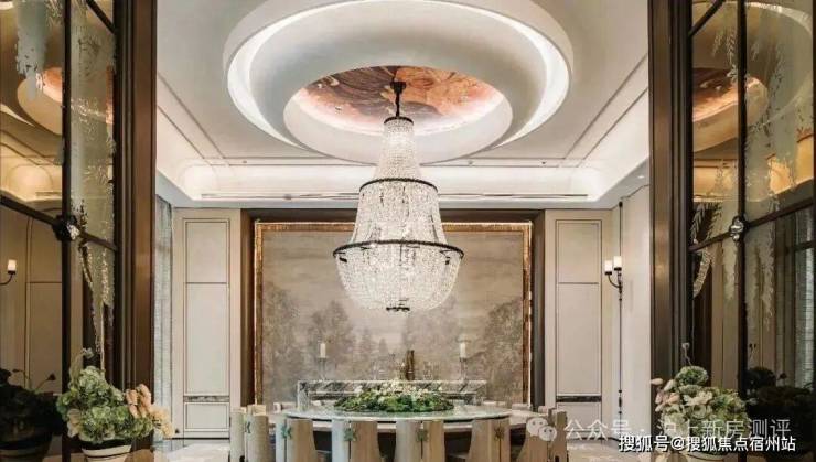 在景观落地窗环绕中,私宴厅以 “花廊序列,美学对景”构筑专属的私谧空间,巨型水晶吊灯与浅色饰面的搭配,色彩质感上相得益彰,营造融合艺术、文化与生活美学的奢享感场域,成就令人神往的优雅社交范式。