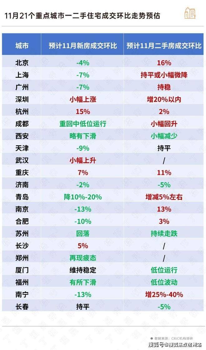 11月新房成交绝对量预计延续低位波动,多数城市新房成交预期由增转降,京沪深杭蓉等核心一二线城市热度回调,市场热度变化与供应规模和质量相关;武汉、南京、苏州、合肥延续弱复苏走势,购房信心逐步修复;南宁、福州、常州等弱二三级城市,预期整体去化率仍处于2成以下低位徘徊。整体而言,当前市场仍处于低位盘整期,市场信心仍有待进一步修复。
