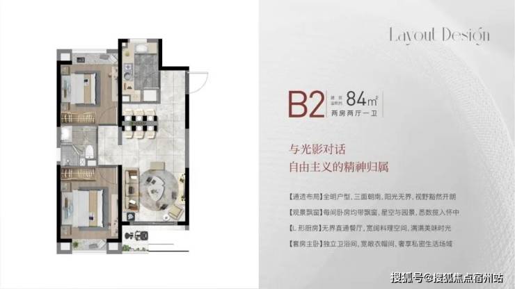 建面约84㎡2房2厅1卫,做到了 双开间朝南+双卧室带飘窗+动静分离 ,非常宽敞的2房户型。