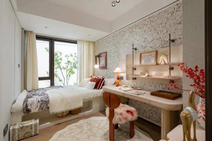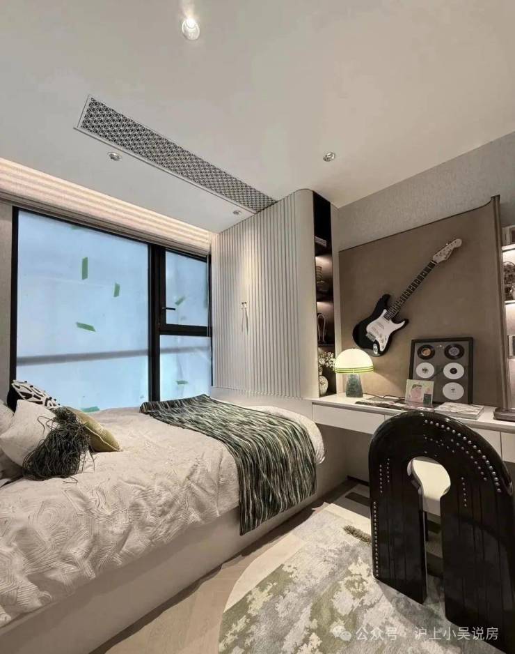 首先,这是北次卧,不仅能放下一张完整的床,还能放下一张大尺寸的办公桌或者是梳妆台,甚至还有空间做一些收纳柜和床头柜等。这样的尺度感和实用性,真的比一般建面约120㎡以上的宽绰3房更加惊人。招商序售楼处电话:400-8894-638