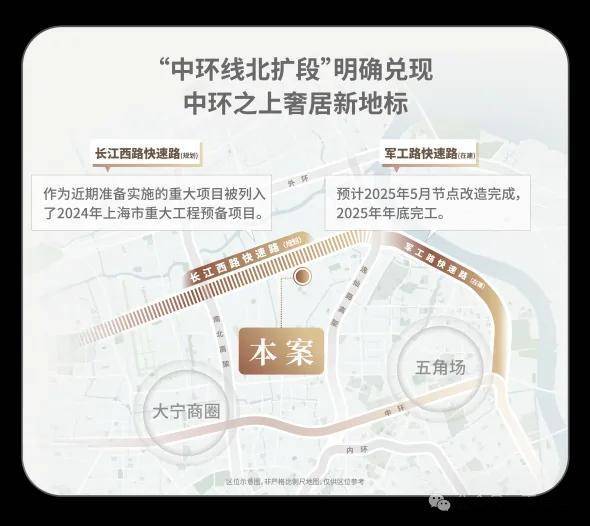 中环线北扩段明确兑现,军工路快速路25年开工,长江西路快速路列入上海市重大工程清单预备项目,快速链通城心, 随着中环线北扩段的政策明确,淞南将正式进入中环时间。未来经逸仙高架,进入南北高架、内环高架、中环高架,可快速链通南北上海;多维立体路网全面升级,未来区域价值再攀新高。