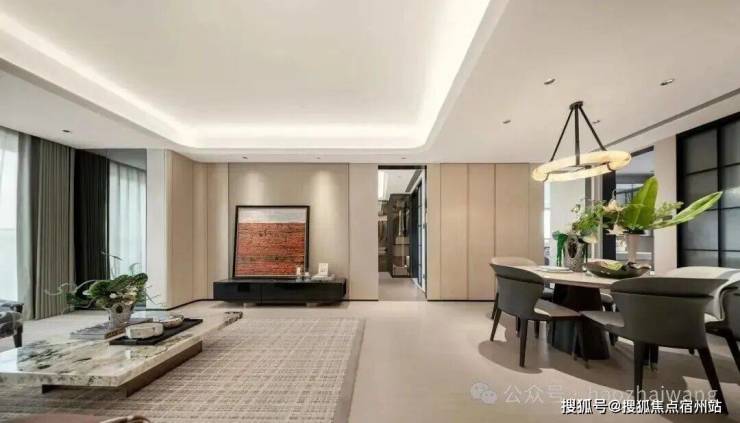 选用岩板+影木木饰面+客厅皮革面背景墙+壁布等名贵材料组合,整体设计雅致而不落俗套,彰显主人的居家质感与生活品味。