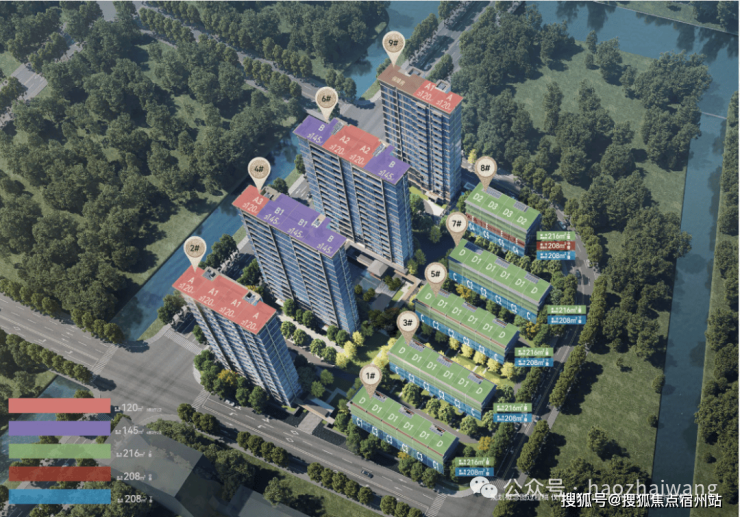 项目规划有4栋14-16F高层及5栋4-5F叠拼,容积率2.0。共计267套商品住宅,主力包括建面约120㎡、145㎡高层户型;建面约208㎡、216㎡叠拼!
