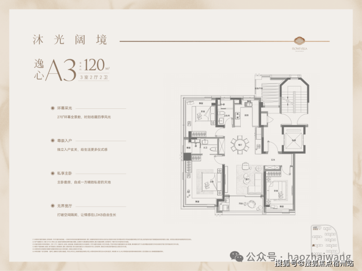 270°转角全景客厅 ,专属于待客与家庭欢聚;楼下为静谧休息区,确保家人生活互不干扰,呵护隐私。 三间卧室均配备独立卫生间,全套房设计充分尊重每一位家庭成员的私密与舒适,彰显人文关怀。