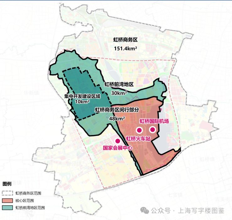 众所周知,虹桥商务区由长宁区、闵行区、青浦区以及嘉定区这4个区各自的一部分面积组成,总规划面积达到151平方公里,其中隶属于长宁区的部分称为东虹桥,隶属于青浦区的部分称为西虹桥,隶属于嘉定区的部分称为北虹桥,隶属于闵行区的部分则有48平方公里,占虹桥商务区总面积近1/3,而虹桥商务区闵行区部分又分为两部分——18平方公里的虹桥枢纽核心片区以及30平方公里的前湾片区。