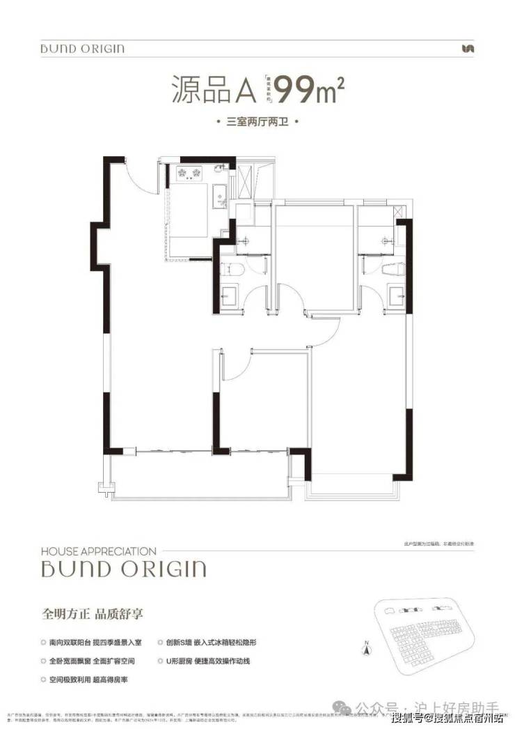 建面约99㎡3房2厅2卫,非常标准的动静分离、三开间朝南户型。