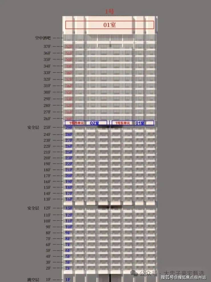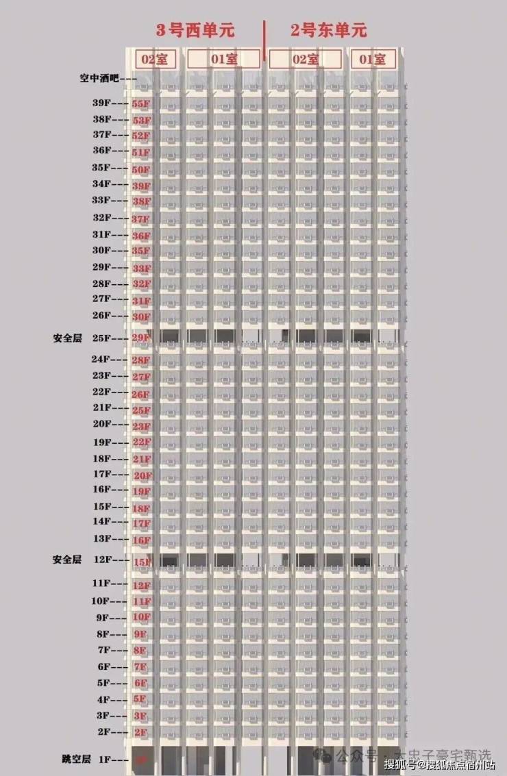 项目分三期开发,2号楼户型分布为一层4户,中间两套为375平米边套为680平米复式,总楼层39层,有两层为避难层,避难层会改造成绿化休闲区。