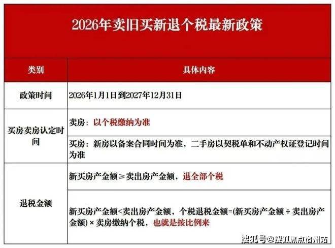 自2026年1月1日至2027年12月31日,对出售自有住房并在现住房出售后1年内在市场重新购买住房的纳税人,对其出售现住房已缴纳的个人所得税予以退税优惠。