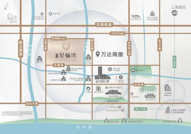 交通方面,「复地·星愉湾」距离金山卫站约4.5km,可直达上海南站;周边更有多条公交线路,在紧邻的万达枢纽站,金山10路、山阳1路、石漕线、朱卫线等十余条公交线路,通达金山全域。