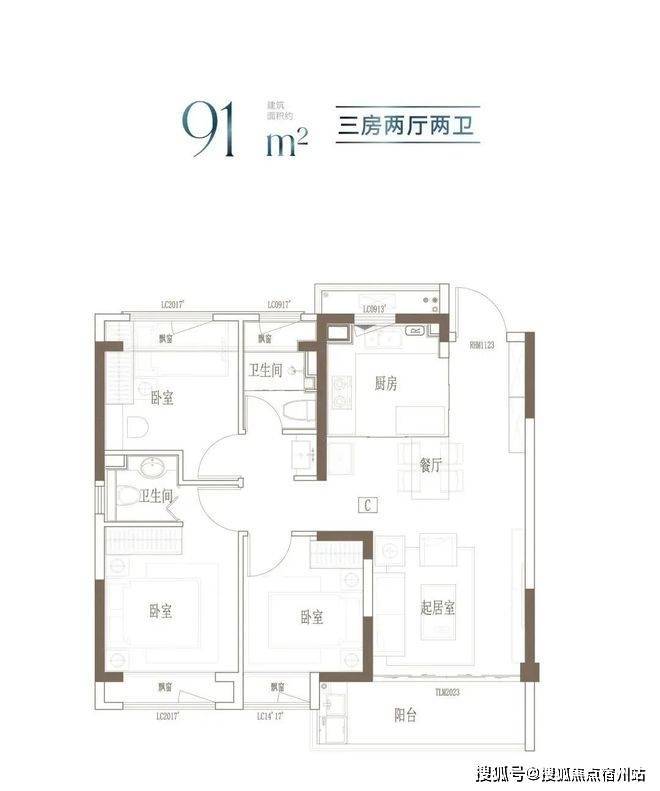 建面约91m²的这个户型,3开间朝南,全屋阳光充足;L型厨房转角移门设计,最大化空间视野;四飘窗设计,通透空间享受;动静分区,亲密有度;套房式主卧,容纳私谧生活点滴。