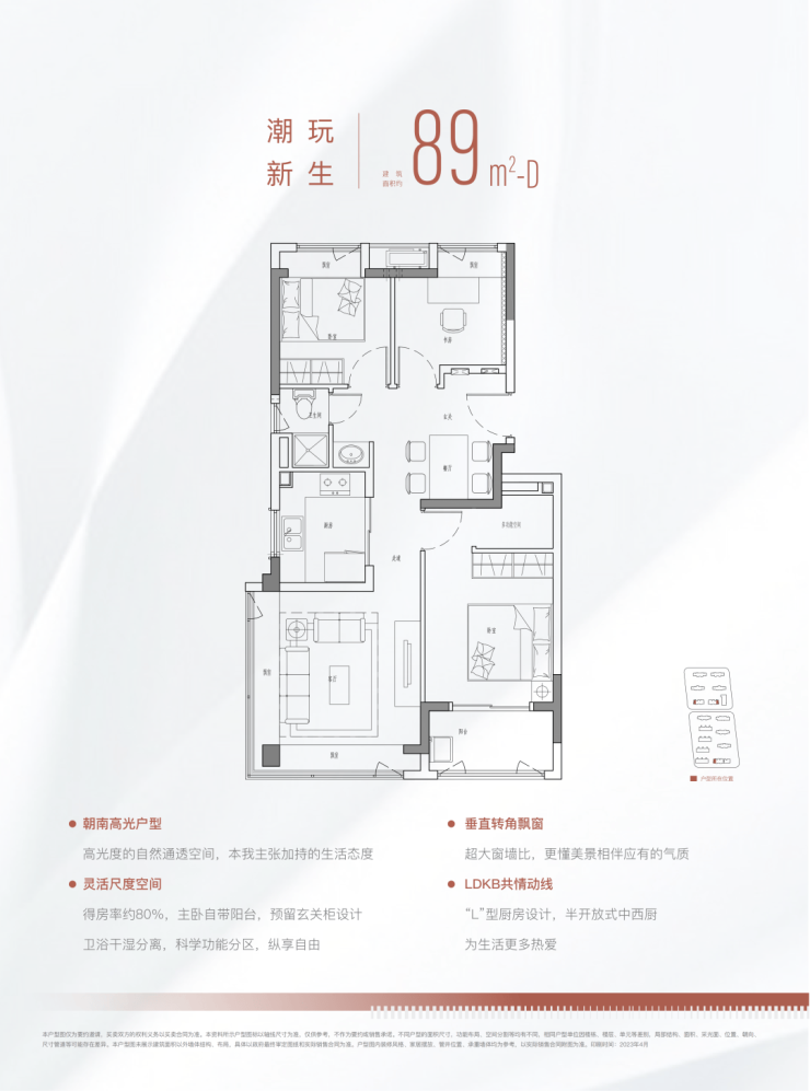 不同于一般的三房把这个小房间直接做了主卫,这个项目把选择权留给了购房者,并在下方铺设了上下水管、相当人性化!除了以上亮点之外,这个户型还有惊喜小细节。为了解决爱买买买的年轻人收纳痛点,户型设计上保留了厨房最大的收纳空间,可以打双组吊柜。在主卧和次卧都预留了收纳柜的位置。除了三开间朝南的经典户型,89m²还做了三面通风的户型。