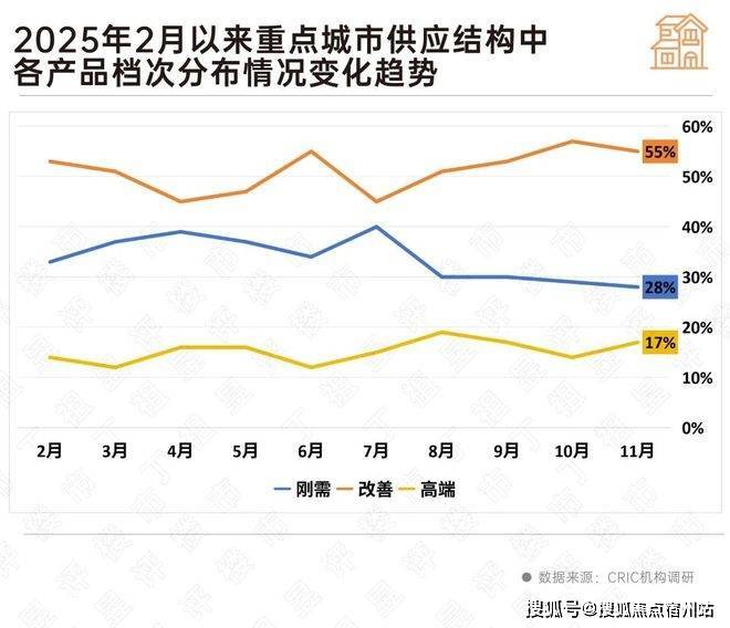 重点城市刚需、改善、高端供应占比结构为28%、55%和17%,刚需占比明显减少,是下半年以来供应占比最低的月份,且年内连续两个月低于30%以下。