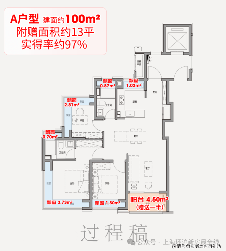 该户型满配6飘窗,比常规户型多2个卫生间飘窗、1个厨房飘窗;再加上阳台送一半面积,经过测算总赠送约9.3平,相当于一间次卧。