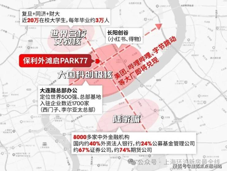保利外滩启PARK77,是大连路总部集群、长阳创谷、杨浦滨江产业带这三大产业共同的芯,凭借极近距离和优越区位,成为三大产业区人才居住优选之地,也是项目未来价值保障。