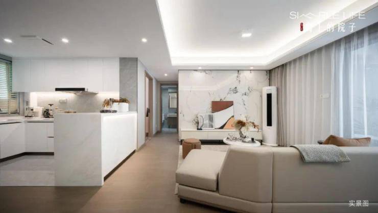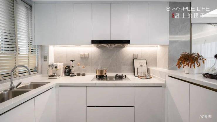厨房是L型布局,有意思的是在侧边做了一个岛台,这个设计在约75㎡的户型中非常少见。
