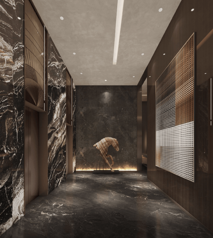 ▲朗阔公区艺术人文走廊配置中央空调,墙面装饰材料为高档艺术墙布,电梯厅装饰材料为高档天然大理石和质感金属,流动的艺术人文走廊,中央空调全覆盖,四季恒温。