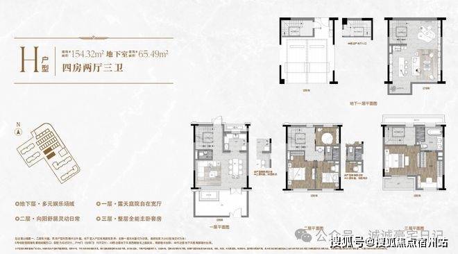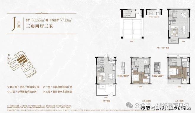 一楼和地下室主社交和志趣,二楼是子女的房间,三楼是主人休憩区。