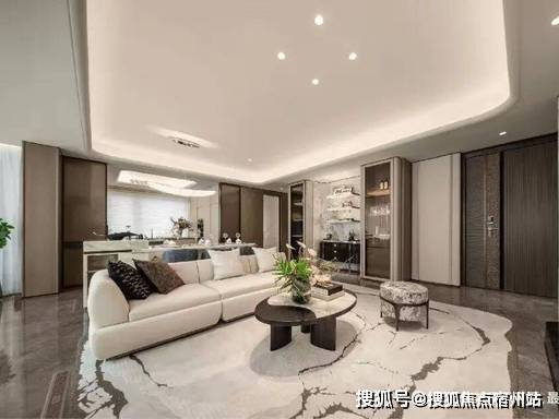石材:全屋铺设芬迪白、奈儿灰等珍稀奢石,背景墙采用天然大理石,纹理独一无二,质感厚重高级。
