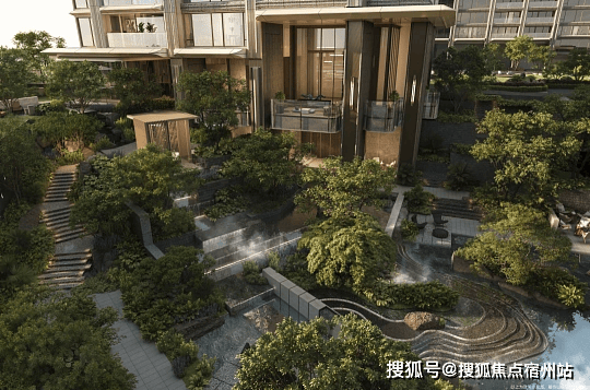 约 3000㎡下沉庭院泛会所,打造 “一轴三进、溪瀑和鸣” 的东方园林。入口景墙、静水庭院、悬浮茶室(距地 15 米)层层递进,全冠移植珍稀乔木,搭配雾森系统与智能灯光,实现 “人在园中行,如在画中游” 的诗意体验。