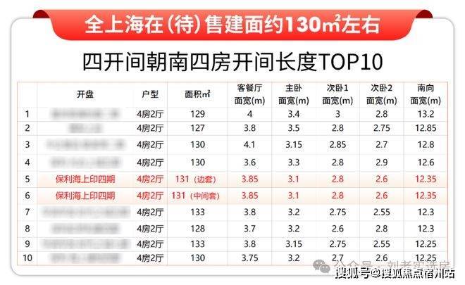 其中保利海上印四期待加推的建面约131㎡四开间朝南4房户型全部上榜,位列第五第六。