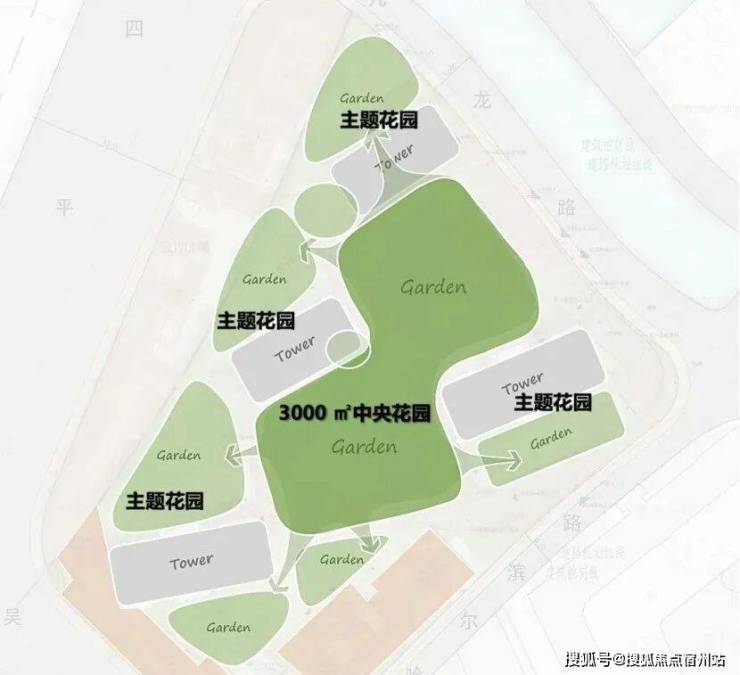 社区景观上,突破市区项目常见的「兵列树阵式」布局,通过建筑楼体的精密偏转,形成罕见的围合式社区形态。