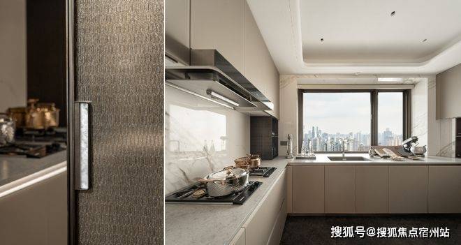 厨房内竹纹夹丝玻璃门、威乃达坡璃烤漆橱柜、与卡拉拉金大岩板台面相融,同时嘉格纳十件套满足每一种味蕾的偏好,厨房内,灶台/油烟机/洗机/冰箱(独立分体设计)五件套;向外,嘉格纳咖啡机/暖碟机/酒柜/烤箱/蒸箱等西厨五件套配置,构筑中西共融的烹饪场域。
