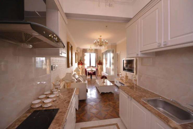 全套欧式家具、窗帘、水晶灯、科勒卫浴、康宝厨房设备。