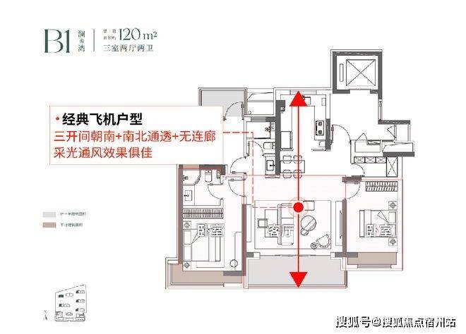 建面约120㎡3房2厅2卫,做到了3开间朝南+双阳台+主卧套房设计+270°转角飘窗,居住体验、舒适度、尺度感倍增!